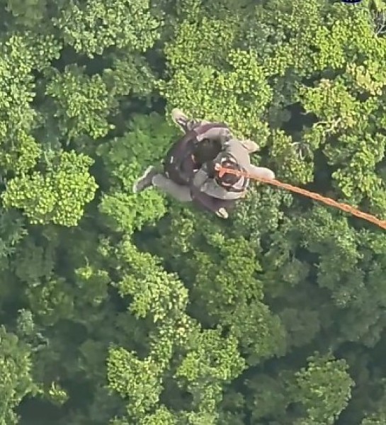 Como a densidade da vegetação impedia o pouso do helicóptero, os operadores precisaram descer até a vítima utilizando a técnica de rapel.