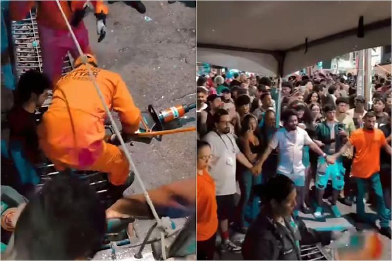 As imagens registram o jovem sentado na rua enquanto os bombeiros realizam o trabalho de desencarceramento. Foliões chegaram a formar uma corrente humana para isolar a área e facilitar o atendimento.